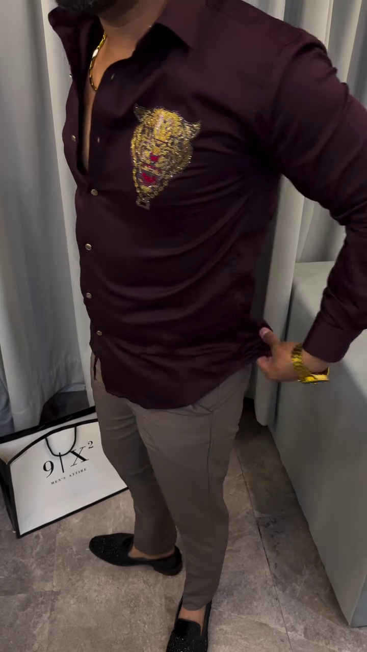 + Free ShippingBurgundy solid party shirt, has a spread collar, button placket, embellished detail, long regular sleeves, curved hem